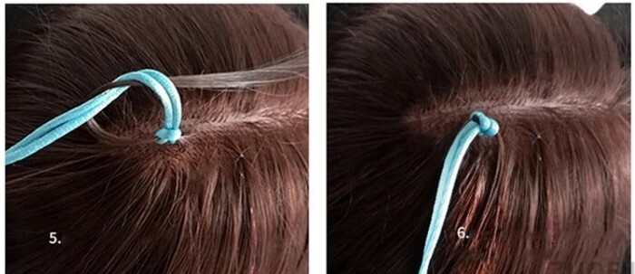 Шаг 1: Сложите нить пополам и завяжите небольшой узел на одном конце, оставив петлю. Шаг 2: Проденьте длинный конец нити через петлю, чтобы получилась подвижная петля-затяжка. Шаг 3: Разделите прядь волос и проденьте ее через созданную петлю. Шаг 4: Аккуратно затяните узел у корней волос, чтобы закрепить прядь. Шаг 5: Дополнительно завяжите обычный узелок из 2-х концов нити и закрепите это место лаком для волос