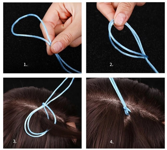 Шаг 7: Протяните конец нити через петлю, чтобы образовался второй узел на волосах. Шаг 8: Затяните нить до конца, чтобы зафиксировать волосы, и убедитесь, что узел плотно держит прядь.